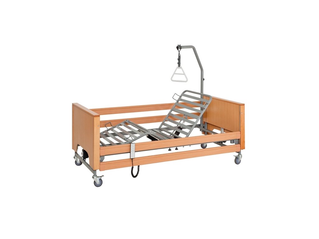 Postel je vybavena čtyřdílnou lomenou konstrukcí s lamelovými rošty a povrchovou úpravou ze světlé laminované desky, která zajišťuje dlouhou životnost a snadnou údržbu. Boční lišty z laminované desky dodávají posteli moderní vzhled a zároveň chrání pacienta před pádem.